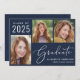 Simple Class of 2025 dark navy blue photo graduation announcement featuring a 3 picture collage and "Graduate" in an elegant white script. Add the grad's name, class year and school or university in modern white typography.