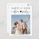 Modern elopement or marriage announcement and reception invitation postcard. The front features your photo and "Happily Ever After Party" in a mix of simple typography and a stylish script with a heart and swashes. Under your photo, add your first names and wedding date. On the reverse side, personalize your message in more detail and add party or reception details and your names in a signature-like script.