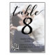this photo card features both table number and qr code for wedding menu on the same side.
