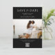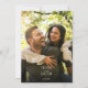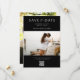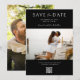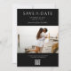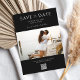 These modern wedding save the date cards feature elegant minimalist typography in white color on black background alongside your own personalized photo.