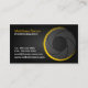 © 2012 Socialite Designs. Modern photographer business card with yellow shutter design and gold text. The shutter design element can be moved and resized on the business card. Choose a different background color and font style to suit your business.