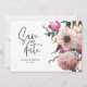 Modern photographic floral wedding save the date. In purples, pinks, browns and green. Modern take on rustic wedding with script handwriting.
