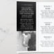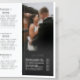 Modern photography trifold brochure showcasing your favorite photos in an elegant black and white design. The front panel has a full bleed photo along with two lines of text over a sheer banner at the bottom. The outside back panel has your business logo and one line of text above a horizontal photo and your contact information below. Add your portrait and your bio to the panel that will fold into the brochure. The inside has one picture on the left and right panels along with a template for information on the left, your packages in the middle and an A la carte price list on the right panel. This professional trifold brochure is perfect for a wedding photographer.