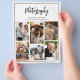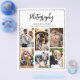 Modern, trendy photography packages and pricing photo collage flyer. Design features 6 photos, typography script ''photography'', your name or studio name and website on the front. Personalize further with 3 additional portfolio photos, packages and pricing guide , qr code, your logo and social media on the back. Photography Price List template allows to easily and effectively showcase the photography packages you offer.