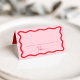 Add a stylish touch to your wedding reception or special event with these Modern Wavy Frame wedding place cards! The retro design displays "Table" in a handwritten red script with space for you to write your guest's name and table number. A red wavy border surrounds the design contrasting with a light pink background. The back of the folded place card features your names and wedding date in bold red lettering.