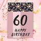 Modern Pink Flowers Floral Woman 60th Birthday Card. The card is pink with a stripe of the pink and yellow simple flower pattern on a black background. Change the age number and customize the message and names inside or delete it.