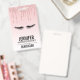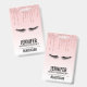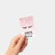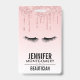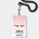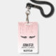 Name badge with a modern, trendy design. For those wish to convey an air of class and elegance. Designed with a background which has an image of sparkling, pink glitter drips. The rest of the background is a delicate pastel pink color gradient. An illustration of a pair of black eyelashes complete the design.
