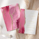 The left-hand edge of this elegant modern wedding invitation features a pink watercolor agate border trimmed with faux gold glitter. The customizable text combines handwriting, copperplate and italic fonts in real gold foil on a white background. The reverse side features a matching pink and gold agate design.