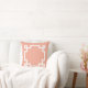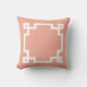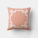 This throw pillow features a classic Greek key border in white on a salmon pink background.
