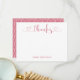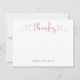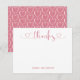 A flowing pink "thanks" script is flanked by sweet little hearts above a personalized name monogram, with a coordinating pink and white heart pattern on the reverse. This charming flat note card is ideal for brides, bridesmaids, bridal showers, baby showers, or any woman who adores pretty personalized stationery. The name monogram is fully customizable.