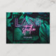 Add your name and contact info to this modern lash studio/eyelash extension business card, featuring tropical dark green foliage and a midnight blue frame. The words "Lash" and "studio" are in purple and pink neon typography with your name underneath it, and your contact details on the back of the card. Contact the designer if you would like a different color on the neon texts.