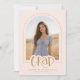 Celebrate your graduate's big achievement with this trendy, double-sided design that combines a stylish announcement with a fun party invitation in a girly aesthetic. The front features a modern blush pink and gold palette with your graduate’s photo cropped into an elegant arch frame, accented by the word "GRAD" in playful handwritten script. The back continues the celebration with a Grad Party invitation surrounded by a whimsical border of hand drawn colorful confetti swirls and stars, topped with a sweet coquette-style bow. This 2-in-1 card is fully customizable, allowing you to easily add your graduate's name, school, class year, and party details for a chic and memorable keepsake. © Kimbellished, LLC