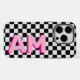 Modern Pink Shadow Monogrammed Personalized Vertical Big Initial Checkerboard iPhone 16 Pro Case - This trendy black and white checkered phone case has large pink vertical shadow monogram on the side which you can customize to make this phone case one of a kind.