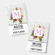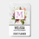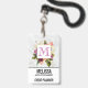 Name badgewith a pretty watercolor design. A floral arrangement of many different varieties of flowers in red, pink and white colors, and lots of leafy green foliage. A frame layered over top with a faux-gold-foil border. Classy and elegant design. An off-white marble pattern background.