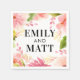 Bold black serif couple's names frame a lush pink watercolor floral background on these modern wedding napkins. The loose, painterly blooms in blush, coral, and green create a vibrant, garden-inspired monogram design. A striking accent for a spring or summer wedding reception, cocktail hour, or engagement party. Personalize with your names.