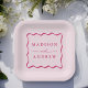 Add a stylish touch to your wedding reception, rehearsal dinner, engagement party, or wedding shower with these Modern Pink Wavy Frame paper plates. The retro wedding paper plates display the couple's names in bold pink lettering surrounded by a pink wavy border contrasting with a light pink background. The trendy wedding paper plates were designed to coordinate with our Modern Wavy Frame wedding collection.