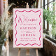 Welcome guests to your wedding in style with this Modern Pink Wavy Frame wedding welcome sign! The design features your names and wedding details in pink lettering contrasting with a light pink background. A pink wavy border surrounds your wedding details giving this wedding welcome sign a retro, yet modern style.