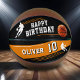 Modern Player Silhouette Happy Birthday Basketball Ball. Celebrate in style with this sleek basketball design! Featuring black and orange color scheme, bold lettering, realistic basketball graphics, this sporty design is perfect for any basketball fan. The design showcases dynamic player silhouettes, a basketball image and stripe details. Whether for a kid or an adult basketball lover, this premium and customizable design is a home run for any birthday celebration!