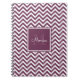 Personalized spiral notebook features a trendy plum chevron pattern with custom name in white handwriting font and monogram in lighter purple shade in matching plum frame.