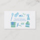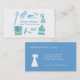 A modern and professional business card with illustrations to surround the business name. They include cleaning supplies such as gloves, detergent, spray bottle, toilet brush, scrub brush, pail and cloth, squeegee, iron and clothes pegs. Color palette of blue and green which communicates a sense of freshness and cleanliness. Perfect for those in the house cleaning services! Personalize easily with your business details in the text templates provided.