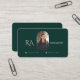 modern and professional plain emerald green business card with your photo within a curved shape and socialmedia icons for a special look for careers in which appearance is needed, design fits any profession, makeup artist, hair stylist, beautician, cosmetologist, wedding planner, lawyer, accountant, consultant, graphic designer, etc