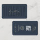 Modern Professional Laundry Dry Clean Monogram Dark Blue business card with QR code