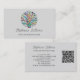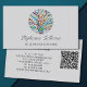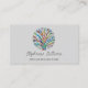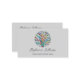 This modern business card is decorated with a colorful mosaic tree of life design and stylish script typography on a gray background.