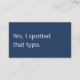 A modern, minimalist business card perfect for freelance proofreaders. The front features a dark blue background with the apt phrase "Yes, I spotted that typo" in off-white text. The reverse has an off-white background with dark charcoal grey text and space for your contact details. All text on the card is fully editable.