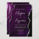 This elegant wedding invitation features a background image of purple watercolor agate trimmed with faux silver glitter. The customizable text combines silver-gray modern handwriting, copperplate and italic fonts. The reverse side features a coordinating purple and silver agate design.