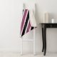 Modern sherpa blanket for girls bedroom features diagonal stripe pattern in purple, black, and white.