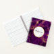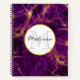 Personalized notebook with a beautiful abstract pattern featuring a marble design. Rich purple colors blending together combined with faux-gold swirling ribbons of color mixing and mingling throughout the design. A circle with a faux gold-foil border layered over top with your personalized text inside.