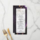 This elegant, modern wedding menu features a watercolor purple agate background trimmed with gold faux glitter. The text appears in elegant gold colored handwriting and black copperplate font on a gray and white marble rectangle. The agate design is repeated on the reverse.