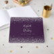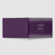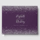 This elegant wedding guest book features top and bottom borders of faux silver glitter on a purple background. Easily customize the silver gray text with the names of the bride and groom in whimsical handwriting calligraphy over a large ampersand. Add additional text of your choice to the front and spine.