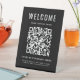 Modern black tabletop pedestal welcome sign for your restaurant business with your QR code for customers to scan for your menu. Upload your QR code and add your restaurant name, phone number, website, slogan or other information in simple white typography.