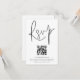Modern QR Code Script Wedding Black and White or Any Color RSVP. A convenient option enclosure to ask your guests to scan your QR code to your wedding website to RSVP. A stylish set typography in black for the main heading RSVP complementing the rest of the text which you can easily personalise. Your QR code will be automatically generated to update the sample code in the design, when you simply change the sample URL in the template with your own wedding website URL.
