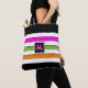 Elevate your summer style with this fun tote bag that features bold stripes in shades of bright pink, green, and orange accented with black color blocking. A customizable monogram completes this versatile design. Modify the name and initial to create a one-of-a-kind gift that’s perfect for women and teens. Whether it’s used for shopping, a day out with friends, a beach vacation, or a weekend getaway, this versatile tote will add a colorful vibe to any outfit, making it the perfect accessory for summer adventures.