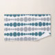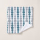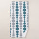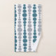 This towel set has a mid-century modern design of teal and gray rounded rectangles in increasing and decreasing size running vertically on a field of white.