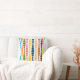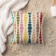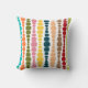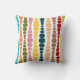 This throw pillow has a mid-century modern design of vertical lines of rounded rectangles in increasing and decreasing size in retro colors of red, green, blue, yellow, orange, and brown on a field of white.