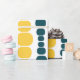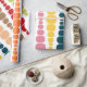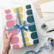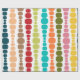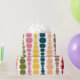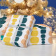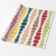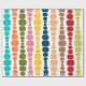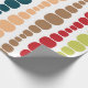 This wrapping paper has a mid-century modern design of vertical lines of rounded rectangles in increasing and decreasing size in retro colors of red, green, blue, yellow, orange, and brown on a field of white.