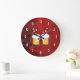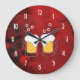 A clock with a modern abstract pattern. Red and black colors swirl, mix and mingle together. Creative, artistic and unique with a dark, mysterious flair. A pair of foamy frothy beer glasses clink together in celebration.