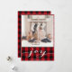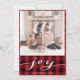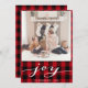 Modern Red Back Buffalo Plaid Elegant Script JOY Holiday Card