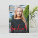 Stylish, modern graduation announcement featuring the graduate's vertical photo with "Graduate" in a red brush script font. Personalize the photo graduation announcement by adding the graduate's name, school name, and graduation year. The trendy graduation announcement reverses to display a red and white striped pattern.