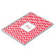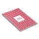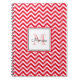 Personalized spiral notebook features a red chevron pattern with custom name in black handwriting font and monogram in pastel red shade in white square frame.