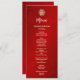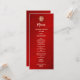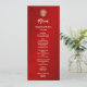 This modern Chinese wedding menu card features a gold double happiness symbol on a shimmering red background. With custom bride and groom names, the wedding date and a custom menu text in a modern handwritten script.