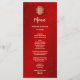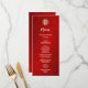 This modern Chinese wedding menu card features a gold double happiness symbol on a shimmering red background. With custom bride and groom names, the wedding date and a custom menu text in a modern handwritten script.