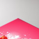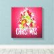 Canvas print with a bright and festive Christmas graphic design. The text says Merry Christmas & Happy New Year. Designed with a tree shaped mound of presents with festive snowflakes, stars, christmas baubles and glowy looking sparkles. Pine tree needles and tree shaped illustration also included in this holiday image. The background is a vibrant reddish pink color.