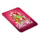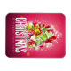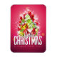 A magnet with a bright and festive Christmas graphic design. The text says Merry Christmas & Happy New Year. Designed with a tree shaped mound of presents with festive snowflakes, stars, christmas baubles and glowy looking sparkles. Pine tree needles and tree shaped illustration also included in this holiday image. The background is a vibrant reddish pink color.