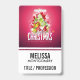 Name badge with a bright and festive Christmas graphic design. The text says Merry Christmas & Happy New Year. Designed with a tree shaped mound of presents with festive snowflakes, stars, christmas baubles and glowy looking sparkles. Pine tree needles and tree shaped illustration also included in this holiday image. The background is a vibrant reddish pink color.