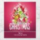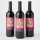 Personalized bottle labels with a bright and festive Christmas graphic design. The text says Merry Christmas & Happy New Year. Designed with a tree shaped mound of presents with festive snowflakes, stars, christmas baubles and glowy looking sparkles. Pine tree needles and tree shaped illustration also included in this holiday image. The background is a vibrant reddish pink color.