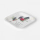 Christian wedding personalized square paper plate depicts a modern winter, Christmas floral design with a simple red rose and berries, evergreens, grey leaves and festive gold sprinkles. It features inspirational quote from Bible Verse Ephesians 5:31, "Two shall become One." Customize with names and date.